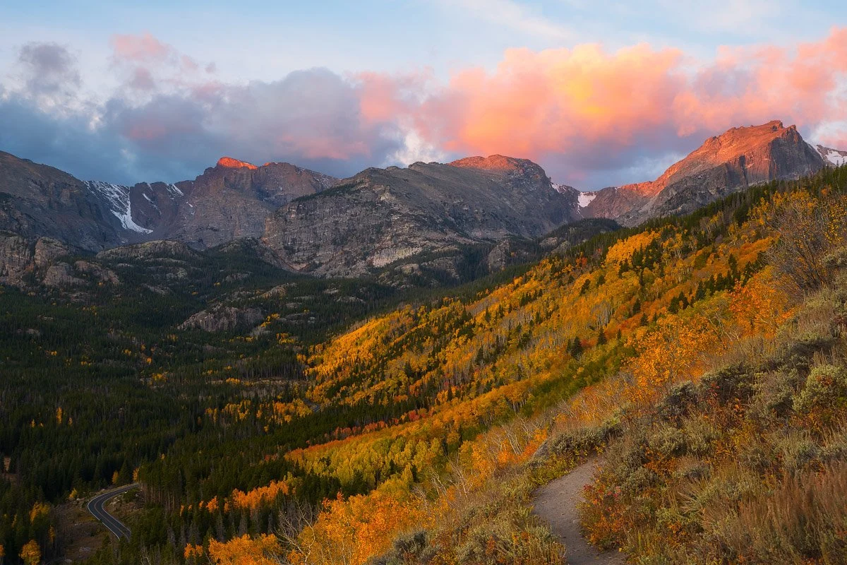A beautiful fall morning with a pre-sunrise hike towards Bierstadt Lake. I stopped about halfway up the trail and saw the first light over the landscape, and realized the hillside full of Aspens with their golden leaves would make a nice composition. I waited for sunrise, and the alpenglow to strike the mountain. I was rewarded with one of my favorite Rocky Mountain National Park photos.